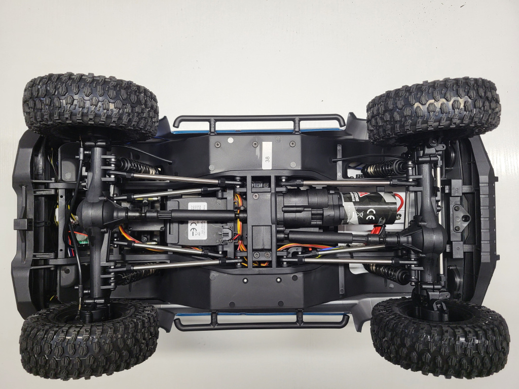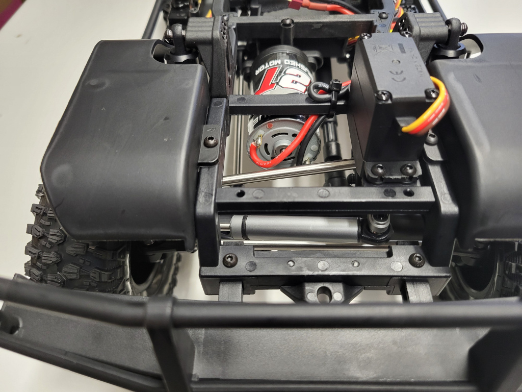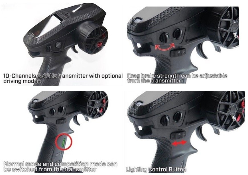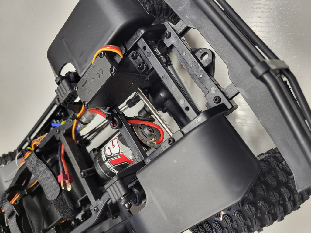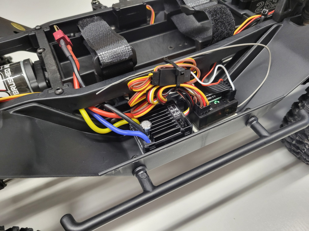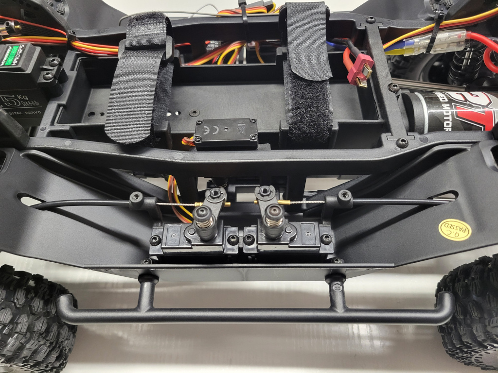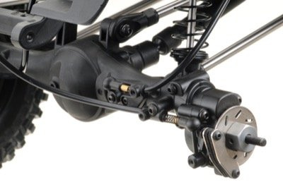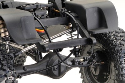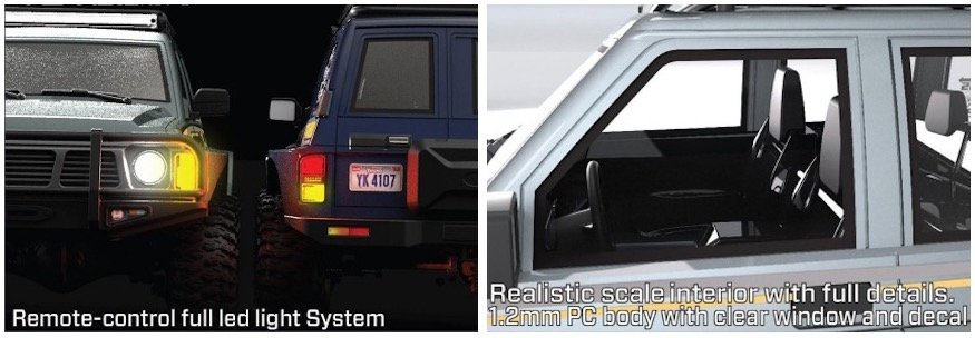 Nová generace expedičního speciálu Absima na podvozku CR4.4 1:10 s excelentními jízdními vlastnostmi. Model má pohon všech kol, je vybaven portálovými nápravami pro maximální průjezdnost terénem. Podvozek má díky novému umístění motru, převodovky a baterie velmi nízké těžiště, což výrazným způsobem vylepšuje jízdní vlastnosti. Dvoustupňová převodovka, uzávěrky diferenciálů, nainstalované LED osvětlení - vše je ovládané z vysílače. Pevný plastový rám s rozvorem 325mm je vybaven plastovými podběhy, které výrazně omezují pronikání nečistot na šasi. Nápravy jsou zavěšené na klasickém 4-linku (kovové linky). Poloosy jsou vybaveny odolnými U klouby, přední kola mají úhel zatočení 45° na každou stranu. Měkké pneumatiky s dezenem typu Hyrax s velkým gripem jsou nalepené na 2.2 plastových diskách. Tlumiče jsou olejové, kovové. Všechny převody jsou kovové (kromě velkého převodového kola u pastorku) a komplet zakrytované. Pastorek s převodovým kolem mají modul M0,6. Silné servo řízení s tahem 25kg s kovovými převody ovládá přední kola přes účinný tlumič řízení, toto řešení výrazně prodlužuje životnost serva a snižuje nároky na jeho výkon (tah). Elektromotor je stejnosměrný typ 550 s velkým točivým momentem. Regulátor je samostatný - Hobbywing WP-1060 60A, BEC 6V/3A s možností nastavení intenzity brzdy v neutrálu otočným ovladačem přímo z vysílače. Konektor na regulátoru je T-Dean. Karosérie je vybavena mnoha maketovými doplňky. Specialitou tohoto modelu je funkce DIG, která při zatáčení v náročném terénu může mechanicky uzavírat/brzdit zadní nápravu a tím výrazně zmenšovat poloměr zatáčení. Na rozdíl od běžných systémů DIG zde nebrzdí obě zadní kola, ale pouze jedno ve vnitřku zatáčky a tím dokáže ještě více snížit poloměr zatáčení a zvýšit manévrovací schopnosti modelu na omezeném prostoru.
