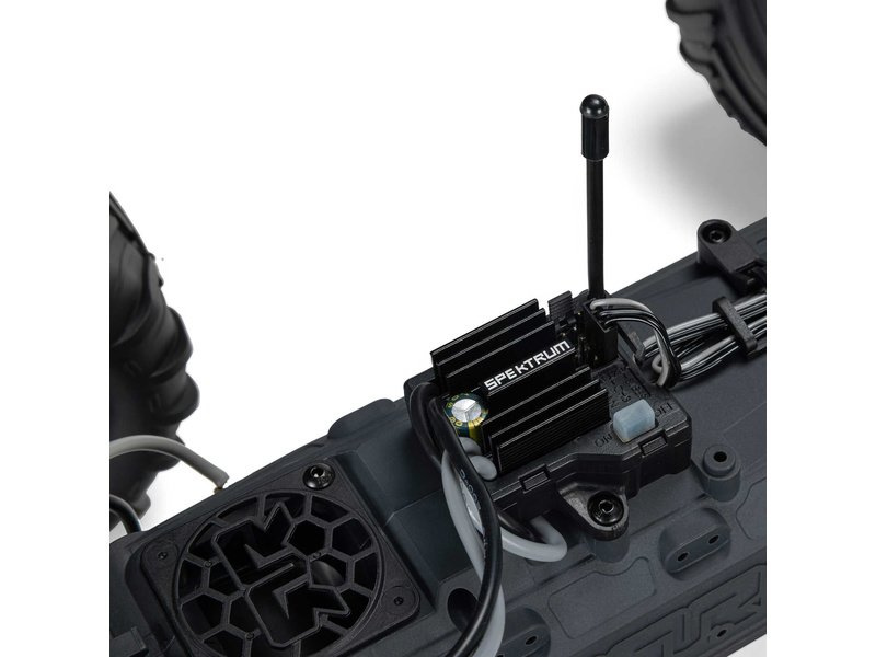 Vysílač Spektrum SLT poskytuje bezpečný provoz bez výpadků a pro začátečníky umožňuje možnost omezení výkonu na 75%, nebo 50%. Pro bezstarostnou jízdu jsou na modelu použity voděodolné* komponenty - regulátor s přijímače Spektrum 2-v-1 25A a servo řízení Spektrum S660 s vysokým točivým momentem.