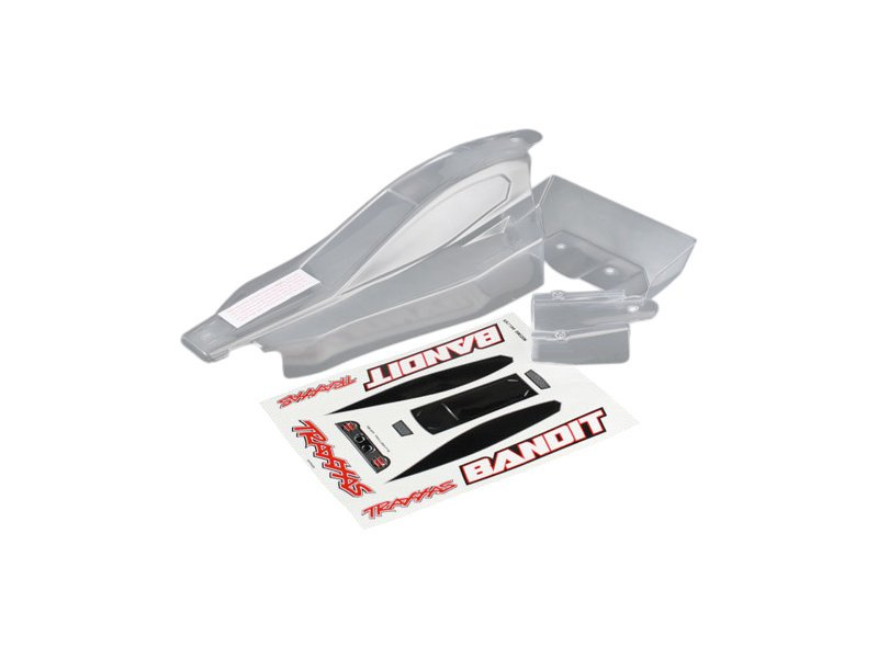 Nenabarvená lexanová karosérie pro RC model auta Traxxas Bandit. Přední a zadní část je oddělená. Balení dále obsahuje arch samolepek.