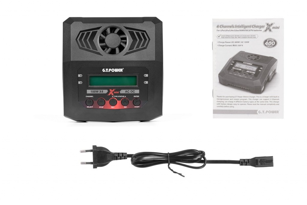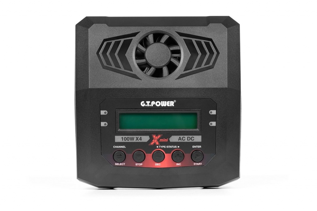 Čtyřkanálový nabíječ G.T. POWER X4 mini 4x100W byl konstruován se snahou poskytnout vše potřebné pro nabíjení až čtyř akumulátorů současně "pod jednou střechou" včetně síťového zdroje a s jednoduchou obsluhou.