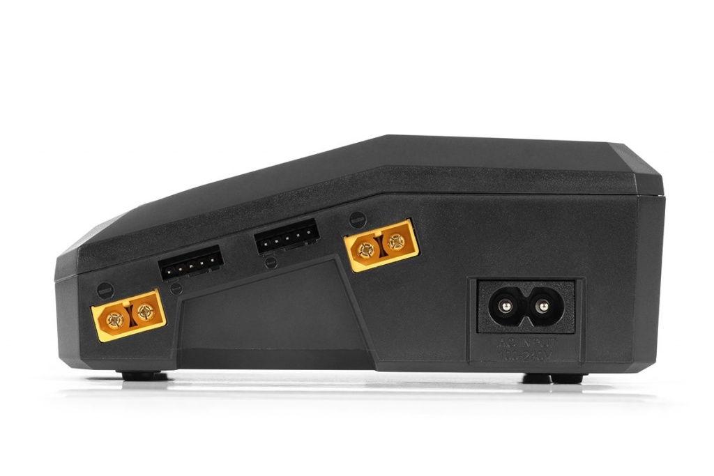 Nabíječ je ve všech kanálech vybaven výstupními zásuvkami XT60 a univerzálními zásuvkami pro servisní konektory JST-XH umožňující přímo zapojit silové kabely akumulátoru a servisní konektory JST-XH sad 2-4S – pokud používáte sady s konektory XT60 a JST-XH, obejdete se zcela bez nabíjecích kabelů a adaptérů.