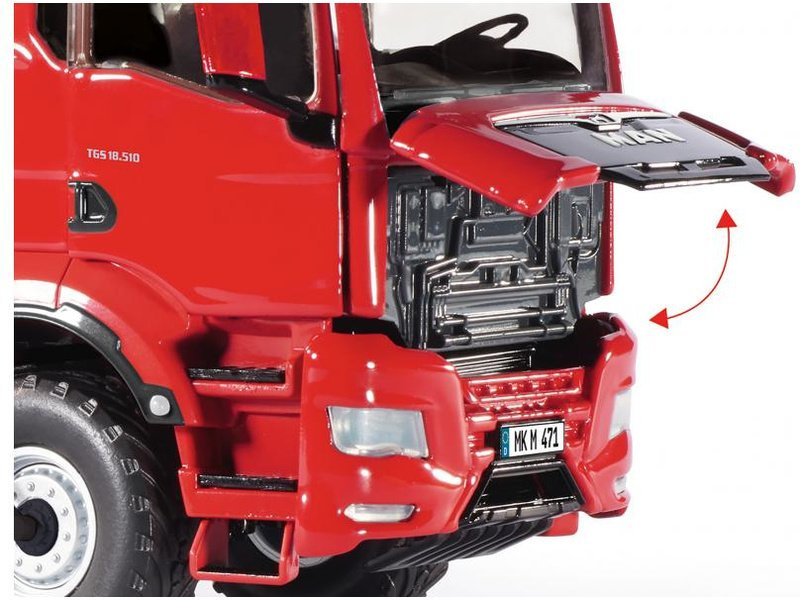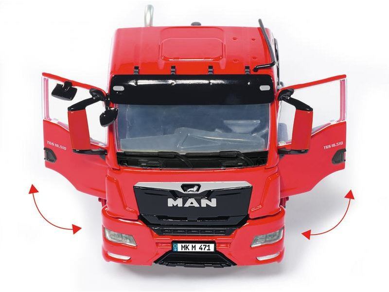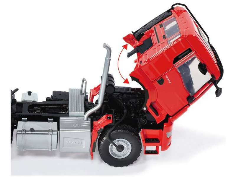 Kovový model tahače návěsů MAN TGS 2 červený v měřítku 1:32, potěší každého příznivce dopravy a zemědělské techniky. Hlavní části jako je kabina, rám podvozku apod. jsou vyrobeny z kovu, plastové části jsou použity pro detaily. Prvky jako jsou loga, registrační značka a nápisy jsou zpracovány pomocí potisku. Model obsahuje velké množství detailů a nechybí funkční části. Je vhodný na hraní pro děti, i ke sběratelským účelům.